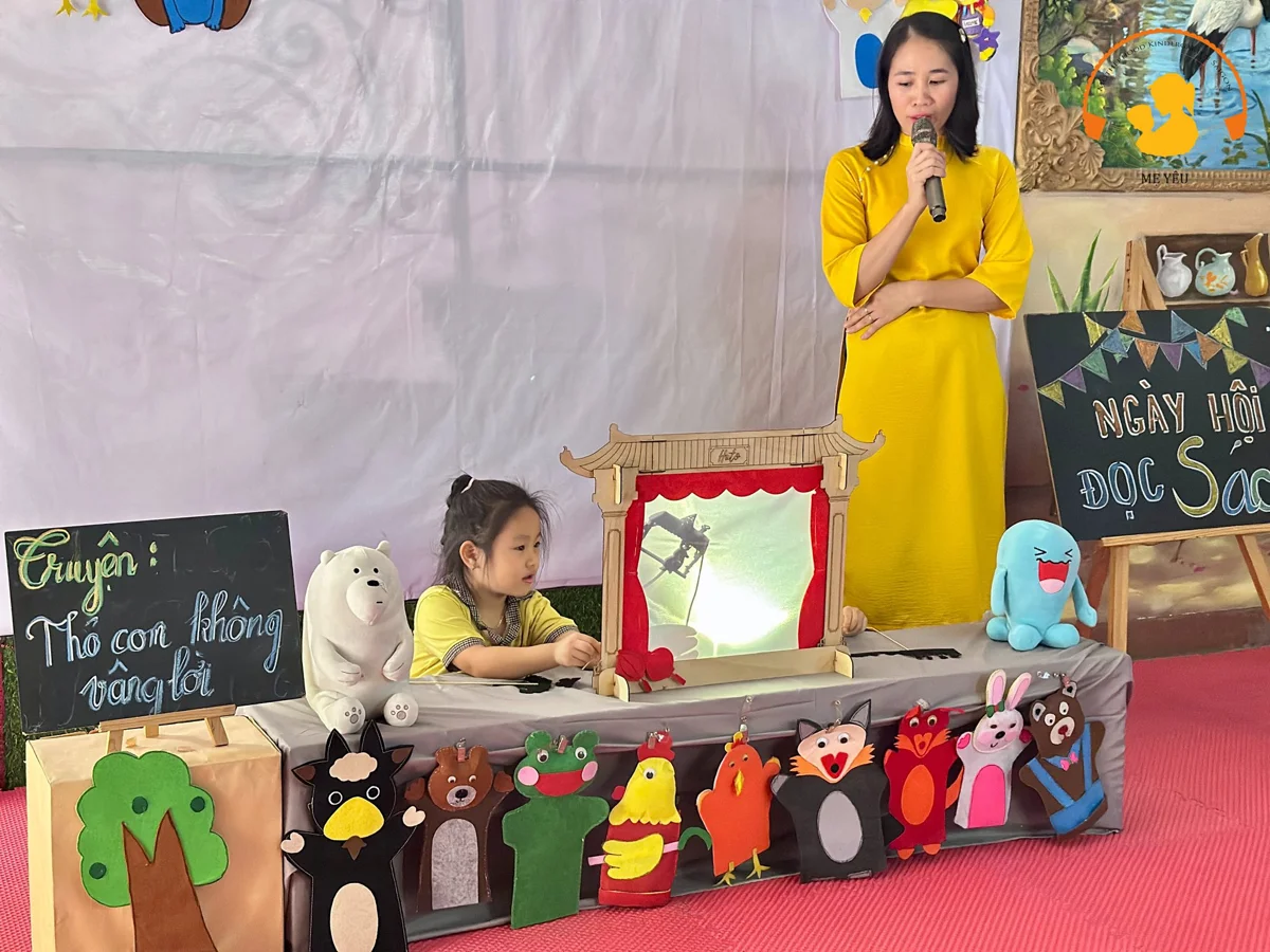 Điểm nhấn của ngày hội chính là tiết mục kể chuyện nghệ thuật. Các bé đã được thám hiểm thế giới loài vật qua giọng kể truyền cảm của cô giáo trong tà áo dài truyền thống, kết hợp cùng sân khấu múa rối bóng sinh động. Câu chuyện "Thỏ con không vâng lời" không chỉ mang đến tiếng cười mà còn gửi gắm những bài học giáo dục nhẹ nhàng, sâu sắc về sự ngoan ngoãn và lễ phép.