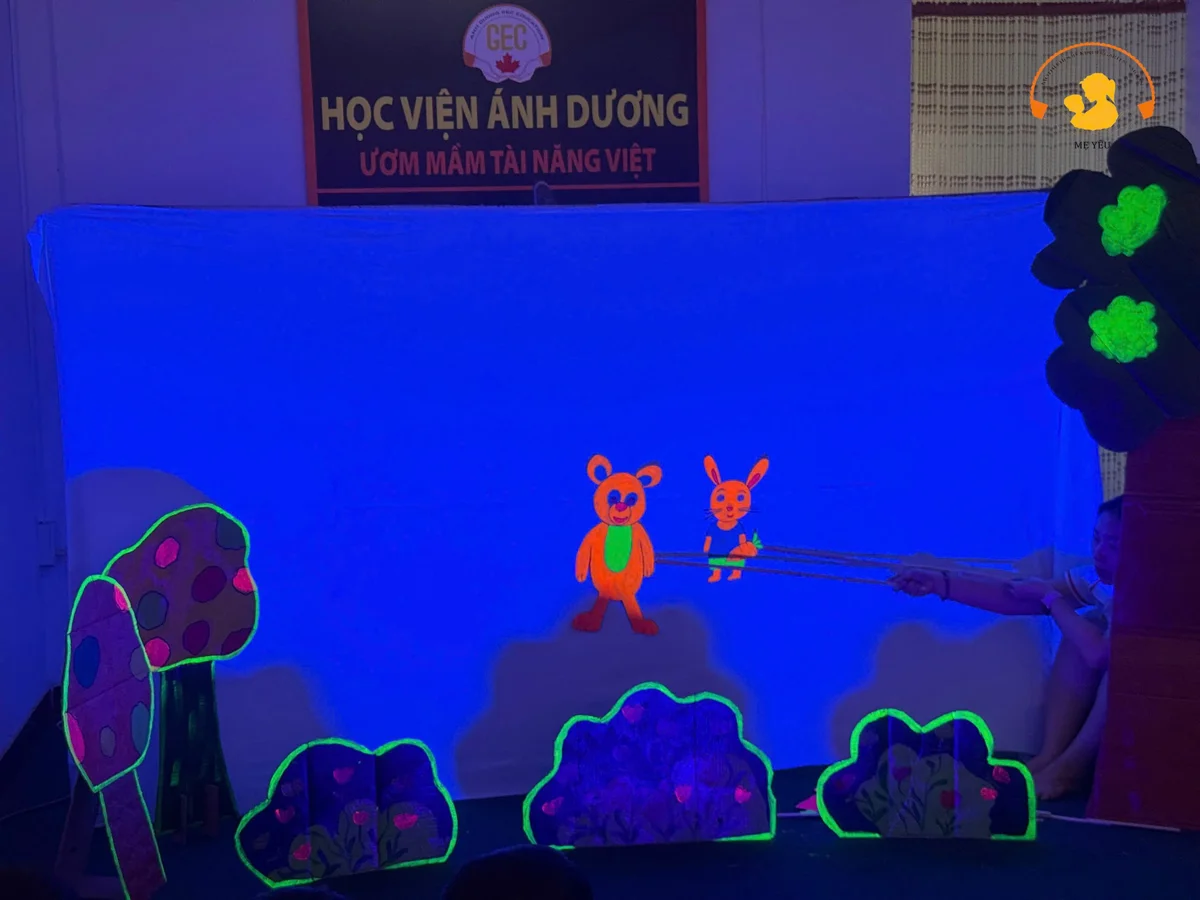 Khi phòng học chuyển sang chế độ ánh sáng xanh huyền bí, dưới ánh đèn huỳnh quang, các nhân vật quen thuộc từ trang sách đột nhiên phát sáng một cách kỳ diệu, lung linh hơn bao giờ hết. Sự kết hợp giữa rối bóng hiện đại và ánh sáng đã tạo nên một thế giới cổ tích về đêm thật rực rỡ và lôi cuốn.