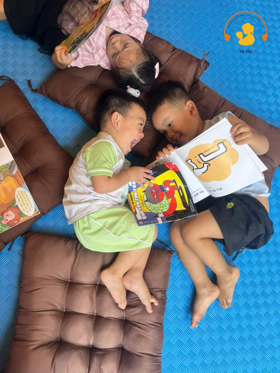 ...Hay là khoảnh khắc các bé trai nằm thảnh thơi trên nệm, chia sẻ cho nhau những tình tiết thú vị và bật cười giòn tan. Chính những nụ cười rạng rỡ ấy là minh chứng rõ ràng nhất cho việc các con đang thực sự "chơi" cùng sách và yêu sách một cách tự nhiên nhất.