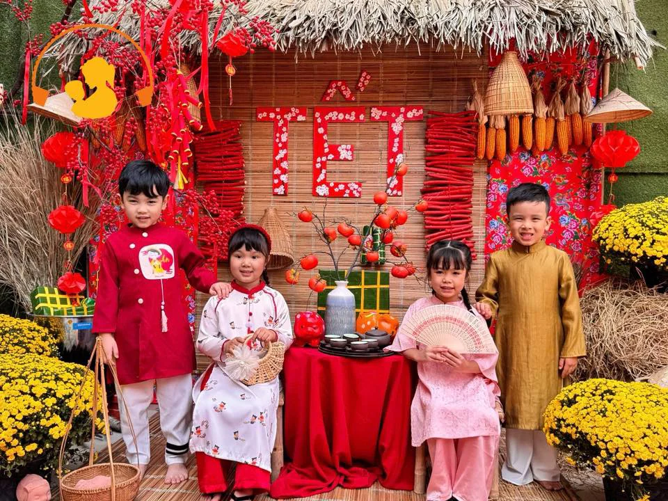 Góc check-in được nhà trường chuẩn bị vô cùng tỉ mỉ với mái nhà tranh, những bắp ngô phơi khô, câu đối đỏ, chậu cúc mâm xôi và cành đào, cành mai khoe sắc. Các bé vô cùng dạn dĩ, tạo dáng tự tin bên bàn trà nhỏ, hóa thân thành những "cậu ấm, cô chiêu" ngày xưa trông vô cùng đáng yêu.